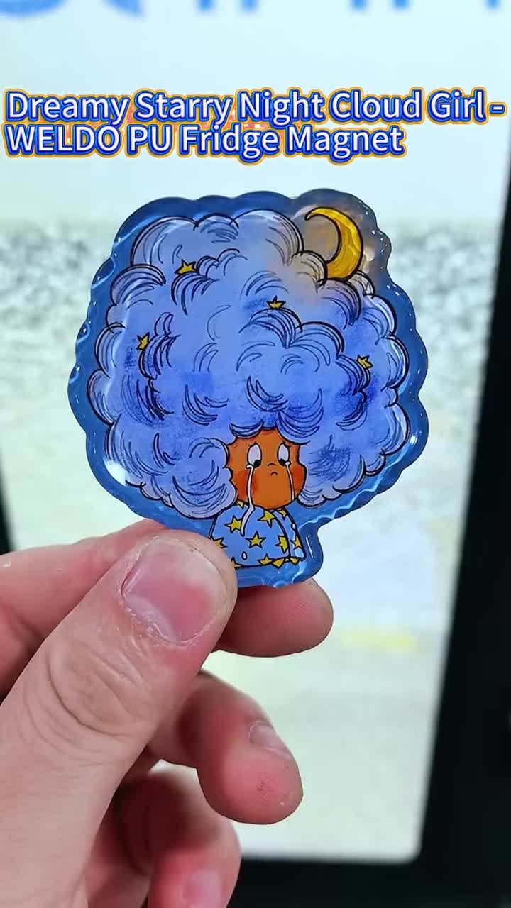 This fridge magnet is themed around a dreamy and soothing style. The overall shape adopts an irregular cloud-like outline design, with smooth and gentle lines, giving a relaxed and warm visual impression. In the center of the picture is a cute cartoon girl, surrounded by fluffy and thick blue "cloud hair", with stars and crescent moon elements scattered in the hair, as if wearing the night sky on her head. The blue and purple gradient color combination with the orange face forms a sharp contrast, making the character more vivid and prominent. The girl's slightly teary expression conveys a touch of委屈 and softness, but the twinkling little stars in her arms convey the meaning of hope and healing. The overall atmosphere is both dreamy and emotionally expressive, and is extremely artistically appealing.